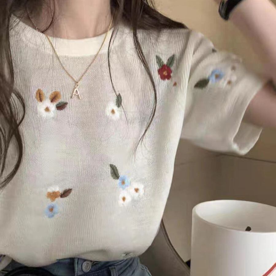繊細な小花の刺繍が魅力のニットトップス。柔らかな素材と洗練されたデザインが、大人の女性の華やかさを引き立てます。自然な魅力と上品さを纏って。