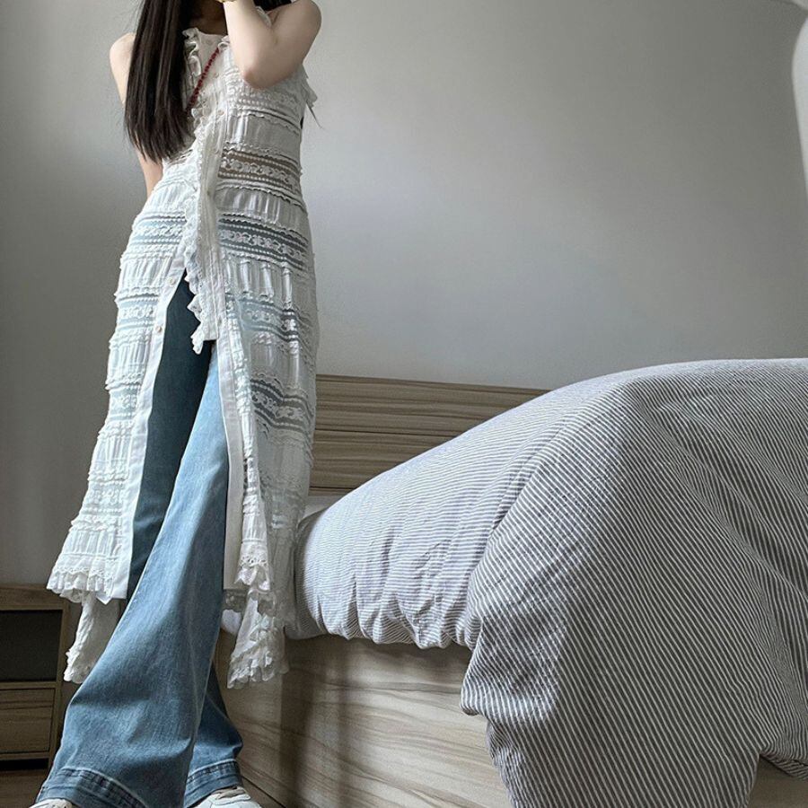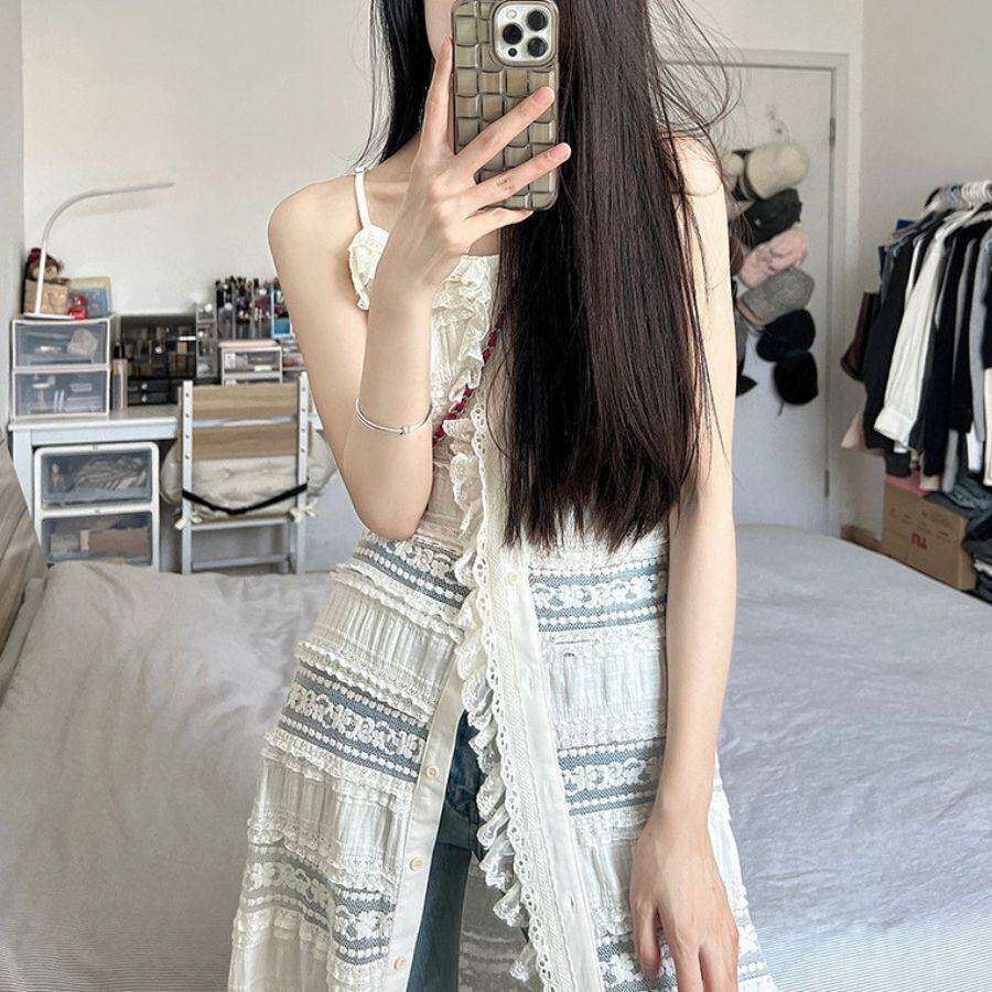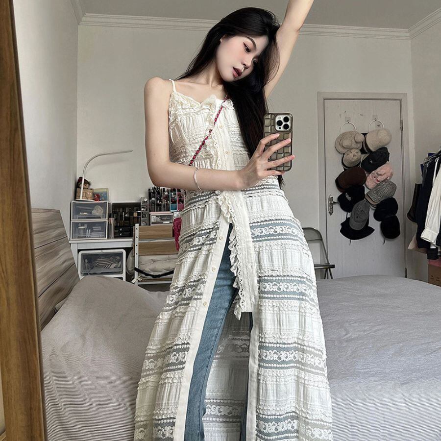 ワンピース 夏 秋 レイヤード レース サイドオープン 花柄 透け感 重ね着 無地 おしゃれ カジュアル WFD170 Chillizen