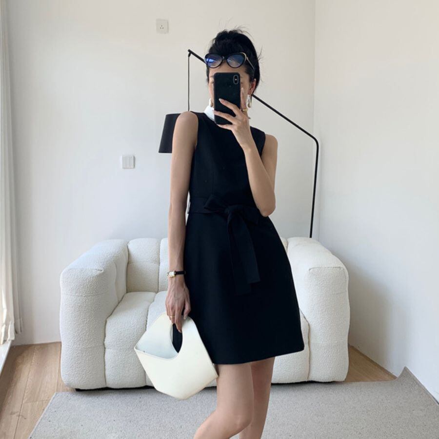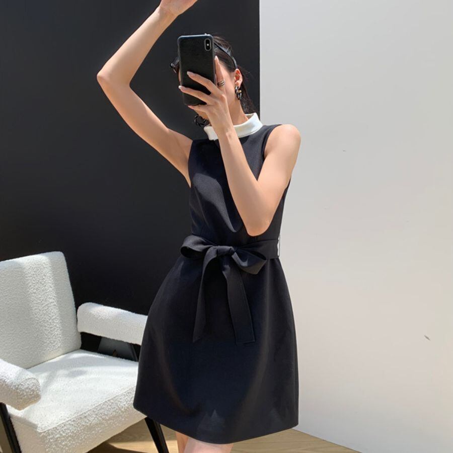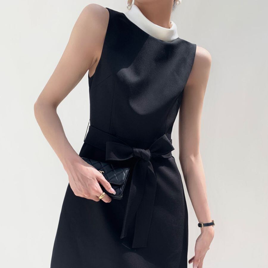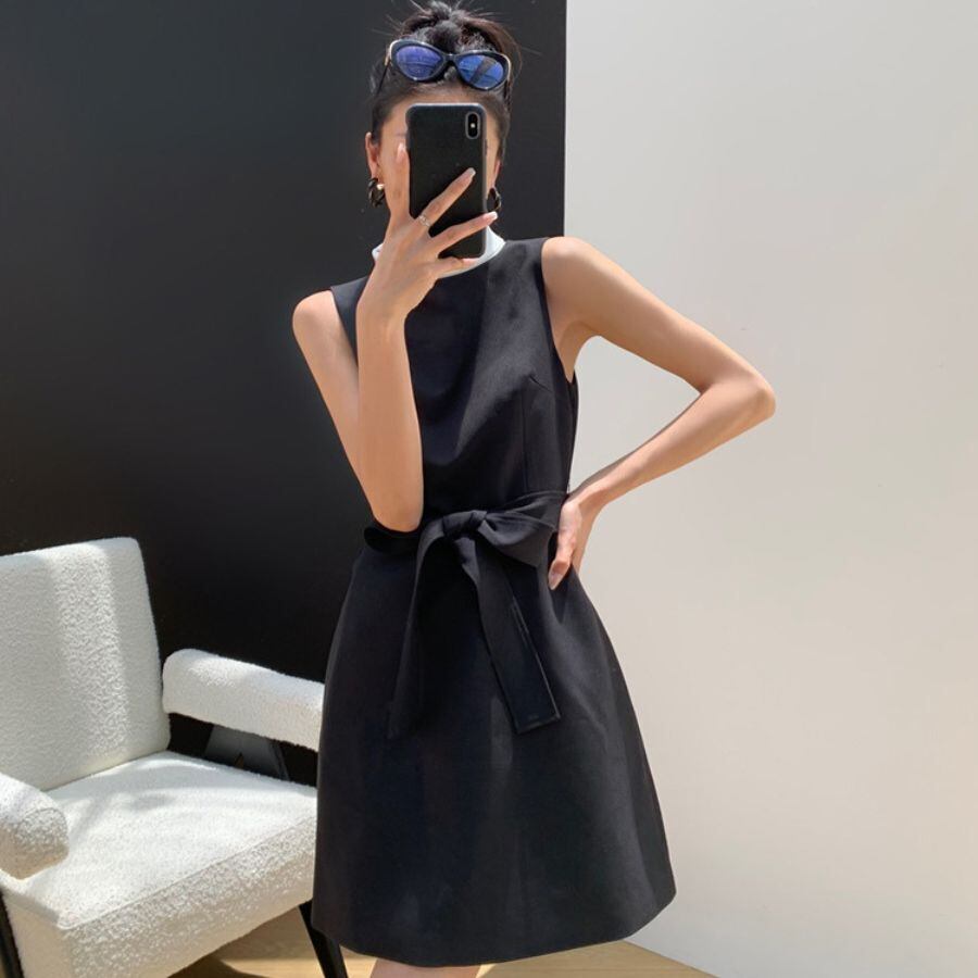 ワンピース 夏 薄手 ノースリーブ 体型カバー シンプル 上品 ウエスト リボン結び 黒 細身 レディース WFD165 Chillizen