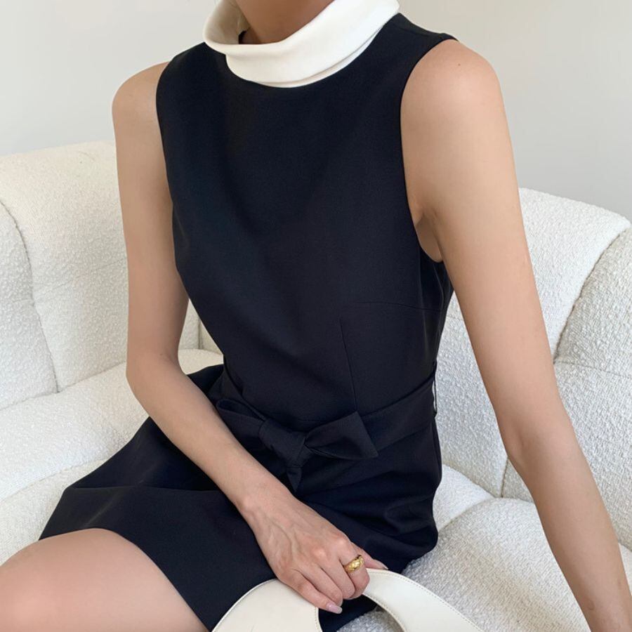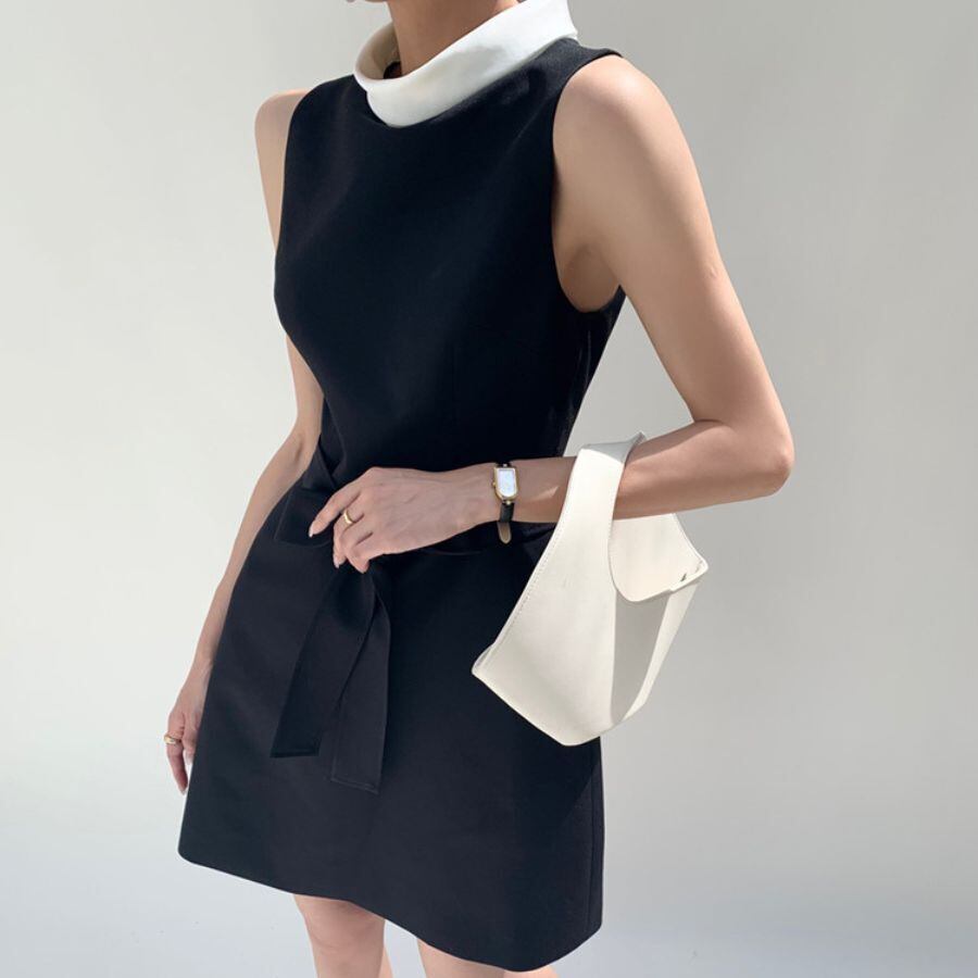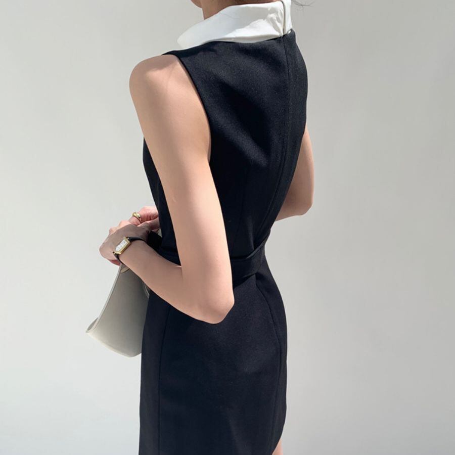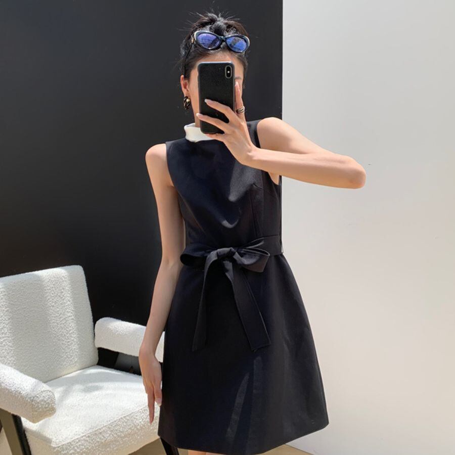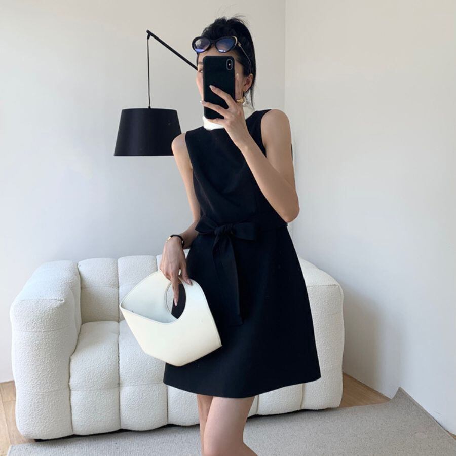 ワンピース 夏 薄手 ノースリーブ 体型カバー シンプル 上品 ウエスト リボン結び 黒 細身 レディース WFD165 Chillizen