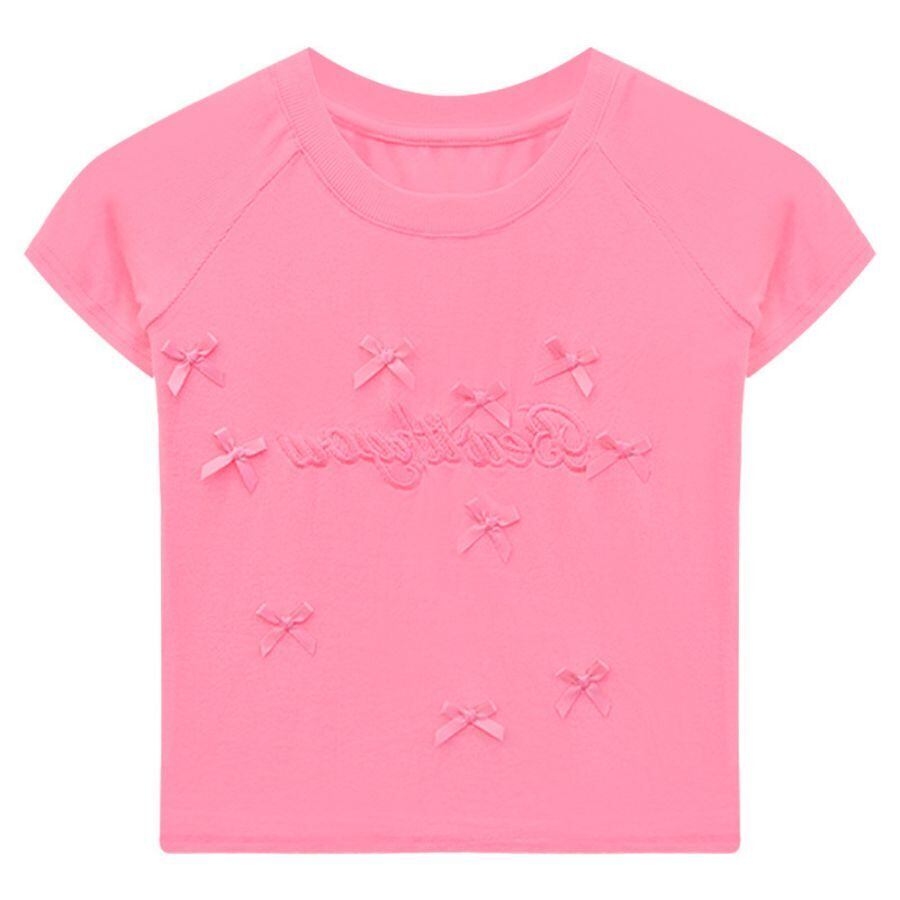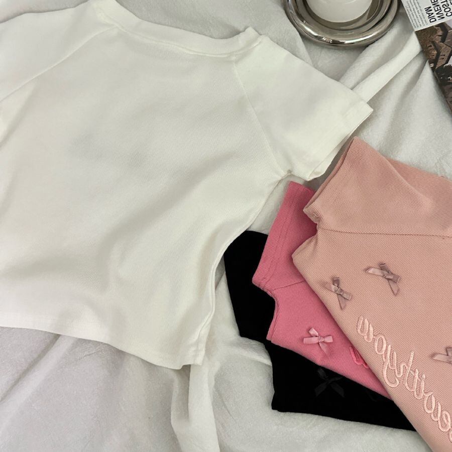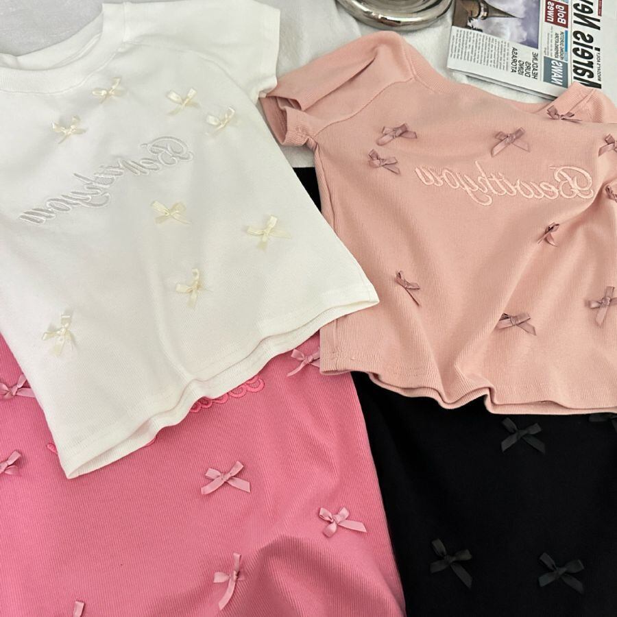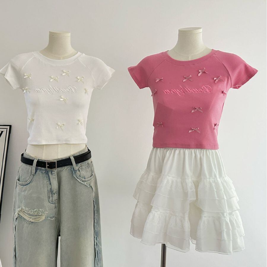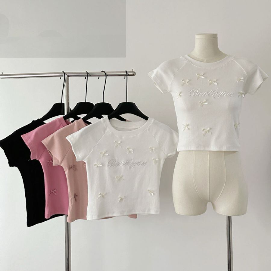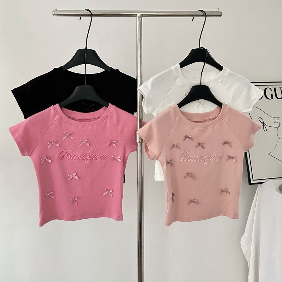 Tシャツ 夏 リボン 刺繍 ぴったり 可愛い シンプル 半袖 レディース オフィス カジュアル きれいめ WFT265 Chillizen